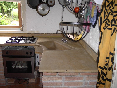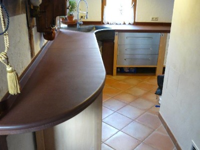 Arbeitsplatte aus rotem Mainsandstein, geschliffen und geölt.