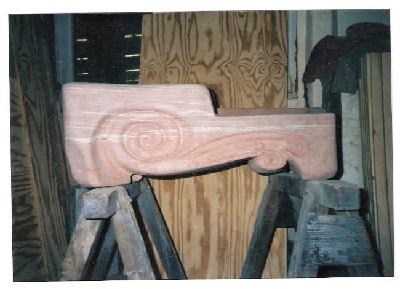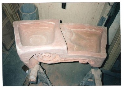 Massives Doppelbecken aus rotem Sandstein, außen behauen